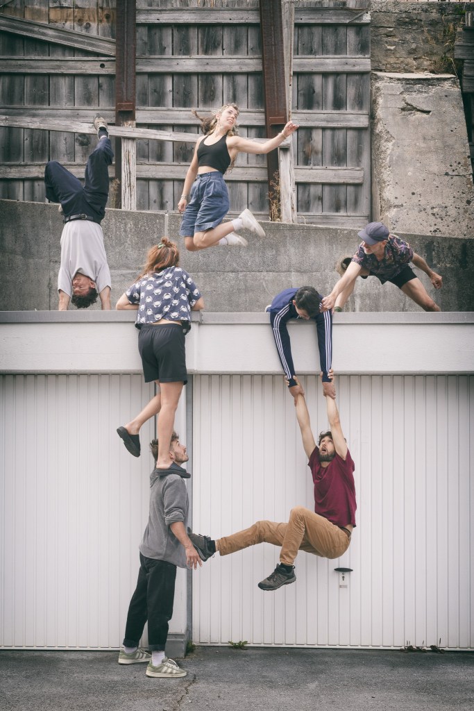 Sept fois la langue mêle dans l’espace public acrobatie, mouvement, théâtre d’objet et écriture in situ avec l’envie de raconter des histoires qu’on peut aimer, rêver. Attachés à la médiation et à la générosité physique de nos spectacles, nous cherchons à travers ces corps qui sautent, qui dansent, qui tombent, à partager notre joie de jouer et notre désir de faire ensemble.
